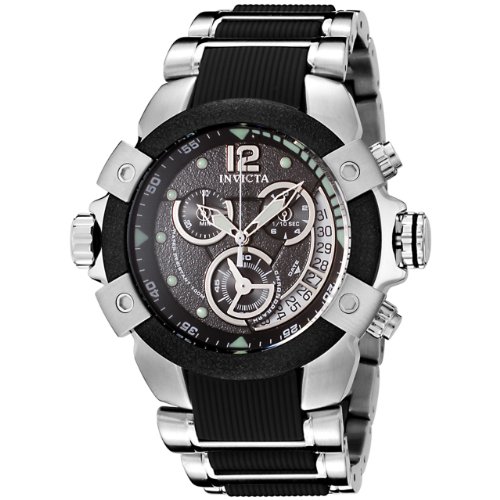 Amazon.com Product Description A stellar design and unique features combine to bring you the innovative Men's Specialty Collection Chronograph Watch from Invicta. Textured with a dense array of shimmery flecks, the round, black dial features an inner rotating bezel, silver-tone skeleton hands with luminous accents, dot hour markers, and performance chronograph functions in three distinct subdials. An innovative date display edges the dial from two o'clock to six o'clock, and a slim, white second hand offers precision time-telling. Silver accents with allen screw details highlight the flecked bezel, enhancing the skillful contrasts of this silver and black watch. Continuing the design, the flexible stainless steel bracelet is detailed with a black center strap of durable polyurethane. This timepiece is water resistant to 330 feet (100 meters).Specialty Collection