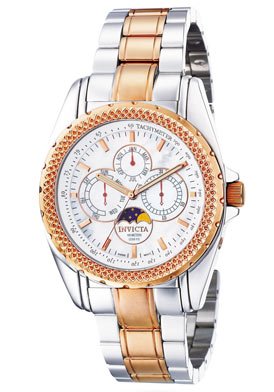 This Invicta Caprice men's watch features a unique, handsome styling that is sure to draw the eye. The stainless-steel, 44-millimeter classic round case boasts a white mother-of-pearl dial with Trinite luminous rose-gold hands and hour markers. Protected by a sapphire crystal, the face sports four chronograph subdials that display the day, date, month, and the current phase of the moon. The stainless-steel bezel brandishes a 23K rose-gold plating, and is unidirectional and marked to provide you with a tachymeter. Showcasing this superlative timepiece and completing the luxuriant theme is a two-tone, polished-silver stainless-steel, 22-millimeter band with a fold-over safety-clasp, and more rich 23K rose-gold plating over the middle segments. Supremely sophisticated with unique functionality, this analog watch is driven by a Swiss quartz movement, and is water resistant to a depth of 330 feet.