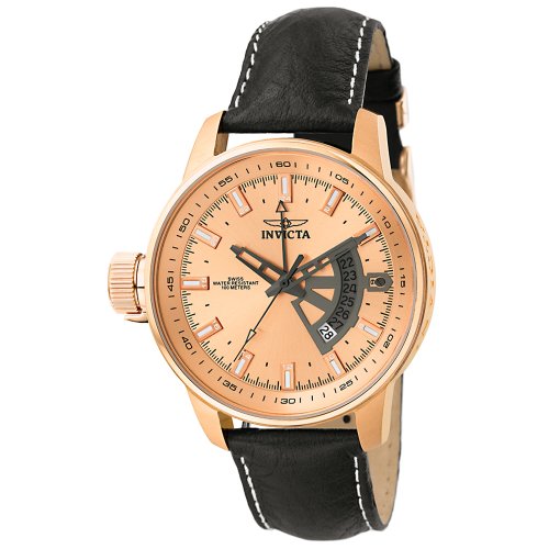 Amazon.com Product Description Designed for left-handed men, the Black Leather Watch from Invicta combines classic styling and superb craftsmanship in a simple yet elegant package. The rose-colored dial features black hands that sweep around luminous indices and a uniquely designed calendar window. A black leather pigskin band with white stitching adds extra style points. Cased in sturdy, rose-gold-plated stainless steel and protected by a resilient mineral crystal, this watch is designed for both durability and accuracy. It's water resistant to 330 feet (100 meters) and features precise Swiss quartz movement.Force Collection